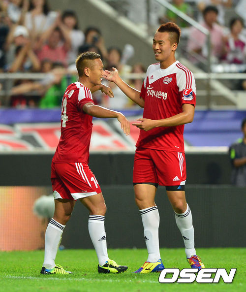 후반 경기 종료 직전 팀의 동점골을 넣은 클래식팀 정대세와 김신욱이 인사를 나누고 있다./ dreamer@osen.co.kr