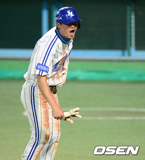 21일 오후 대구시민운동장 야구장에서 열린 2013 한국야쿠르트 세븐프로야구 삼성 라이온즈와 LG 트윈스의 경기, 9회말 2사 1,3루에서 LG 봉중근의 폭투 때 홈을 밟은 3루주자 김상수가 환호하고 있다.