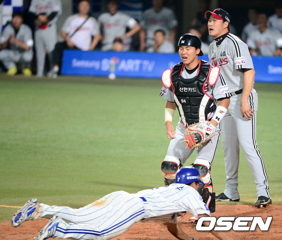 21일 오후 대구시민운동장 야구장에서 열린 2013 한국야쿠르트 세븐프로야구 삼성 라이온즈와 LG 트윈스의 경기, 9회말 2사 1,3루에서 LG 봉중근의 폭투 때 홈으로 쇄도한 3루주자 김상수가 세이프 되고 있다.