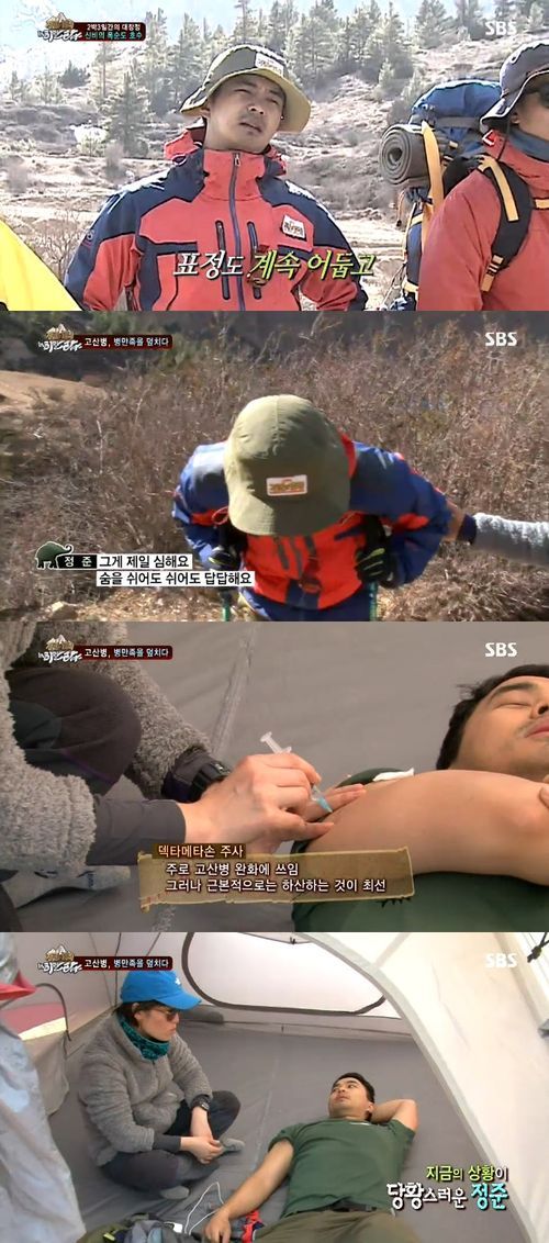 정준은 "숨을 쉬어도 답답하고 자꾸 토할 것 같다"고 말해 응급치료를 실시, 고산병 증세를 개선하는 주사까지 맞았다. 갑작스러운 고산병에 정준은 "체력이 좋은 편인데 이렇다"고 당황스러워 했다.