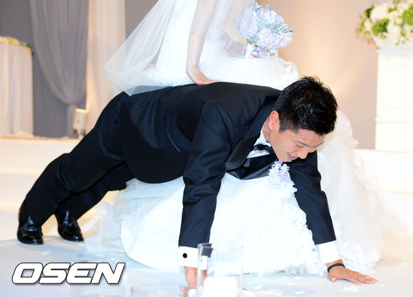 신랑 김재성이 신부를 업고 푸시업을 하고 있다.