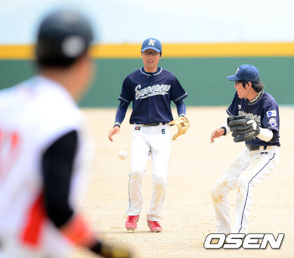 22일 오전 경기도 김포시 송일야구장에서 열린 '제4회 니베아 맨 컵 전국생활체육 야구대회' A-Yo!스위퍼스와 번개야구단의 경기 6회초 2사 3루 전재기의 뜬공을 스위퍼스 수비들이 놓치고 있다.