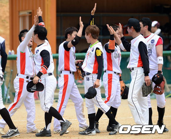 22일 오후 경기도 김포시 송일야구장에서 열린 '제4회 니베아 맨 컵 전국생활체육 야구대회' A-Yo!스위퍼스와 번개야구단의 경기 종료 후 번개야구단 선수들이 하이파이브를 하고 있다.