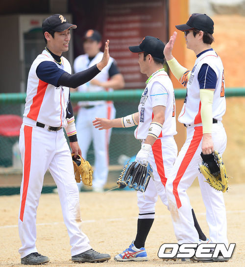 22일 오후 경기도 김포시 송일야구장에서 열린 '제4회 니베아 맨 컵 전국생활체육 야구대회' A-Yo!스위퍼스와 번개야구단의 경기 종료 후 번개야구단 선수들이 하이파이브를 하고 있다.