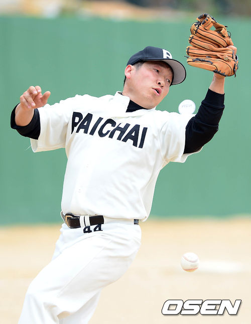 22일 오후 경기도 김포시 송일야구장에서 열린 '제4회 니베아 맨 컵 전국생활체육 야구대회' 로턱스와 배재의 경기 1회초 배재 선발투수가 공을 놓치고 있다.