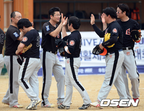 22일 오후 경기도 김포시 송일야구장에서 열린 '제4회 니베아 맨 컵 전국생활체육 야구대회' 로턱스와 배재의 경기 종료 후 로턱스 선수들이 하이파이브를 하고 있다.