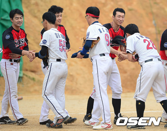 22일 오후 경기도 김포시 송일야구장에서 열린 '제4회 니베아 맨 컵 전국생활체육 야구대회' 살사야구단과 엔티플러스의 경기 종료 후 선수들이 악수를 나누고 있다.