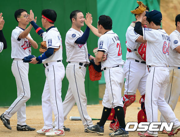 22일 오후 경기도 김포시 송일야구장에서 열린 '제4회 니베아 맨 컵 전국생활체육 야구대회' 살사야구단과 엔티플러스의 경기 종료 후 엔티플러스 선수들이 하이파이브를 하고 있다.