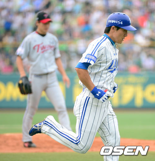 22일 오후 대구시민운동장 야구장에서 열린 2013 한국야쿠르트 세븐프로야구 삼성 라이온즈와 LG 트윈스의 경기, 1회말 무사에서 삼성 배영섭이 좌월 솔로홈런을 치고 그라운드를 돌고 있다.