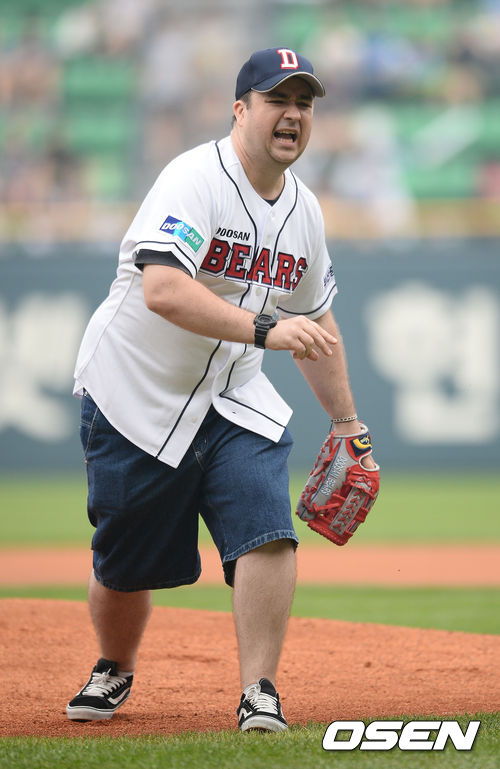 22일 서울 잠실구장에서 열린 '2013 한국야쿠르트 세븐 프로야구' 두산 베어스와 한화 이글스의 경기전 샘 해밍턴이 시구를 한 뒤 아쉬운 표정을 짓고 있다.