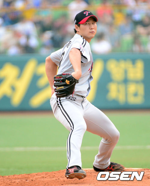 22일 오후 대구시민운동장 야구장에서 열린 2013 한국야쿠르트 세븐프로야구 삼성 라이온즈와 LG 트윈스의 경기, 1회말 무사에서 LG 선발투수 신재웅이 힘차게 공을 던지고 있다.