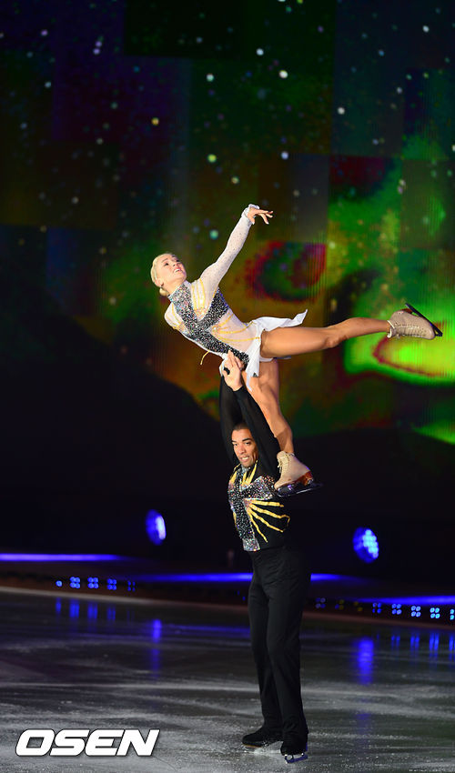 알리오나 사브첸코와 로빈 졸코비가 빙판 위에서 화려한 연기를 선보이고 있다.