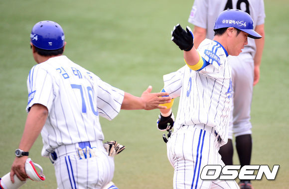 22일 오후 대구시민운동장 야구장에서 열린 2013 한국야쿠르트 세븐프로야구 삼성 라이온즈와 LG 트윈스의 경기, 2회말 무사 1루에서 삼성 조동찬이 좌월 투런홈런을 치고 김태균 코치와 하이파이브를 하고 있다.