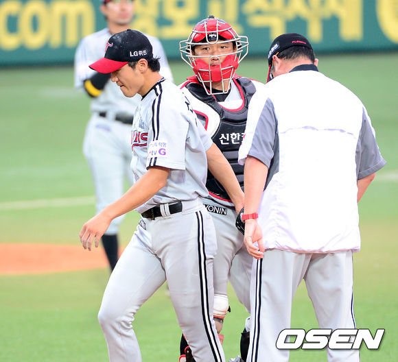 22일 오후 대구시민운동장 야구장에서 열린 2013 한국야쿠르트 세븐프로야구 삼성 라이온즈와 LG 트윈스의 경기, 3회말 무사 1,2루에서 LG 신재웅이 마운드를 내려가고 있다.