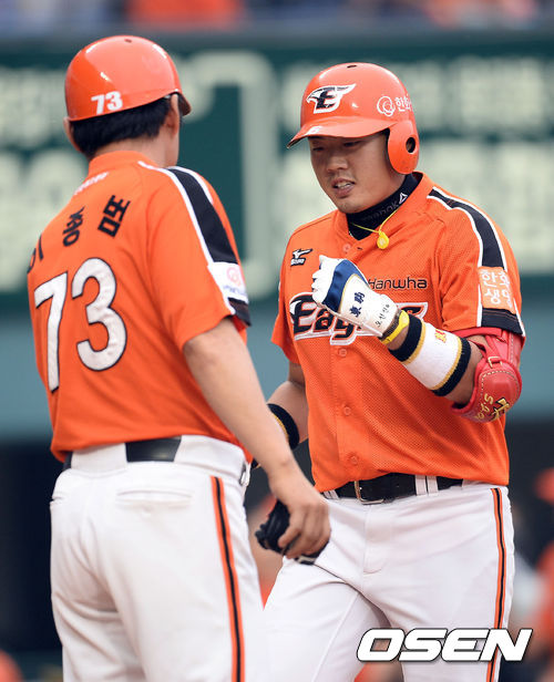 22일 서울 잠실구장에서 열린 '2013 한국야쿠르트 세븐 프로야구' 두산 베어스와 한화 이글스의 경기, 4회초 1사 1,2루 한화 오선진이 좌측담장을 넘기는 3점 홈런을 때린 뒤 이종범 코치와 기뻐하고 있다.