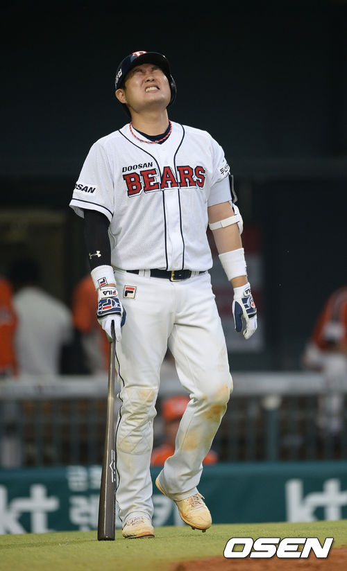 22일 서울 잠실구장에서 열린 '2013 한국야쿠르트 세븐 프로야구' 두산 베어스와 한화 이글스의 경기, 6회말 1사 2,3루 두산 양의지가 한화 김광수가 던진공에 맞은 뒤 고통을 호소하고 있다.