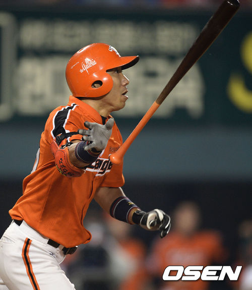 22일 서울 잠실구장에서 열린 '2013 한국야쿠르트 세븐 프로야구' 두산 베어스와 한화 이글스의 경기, 8회초 2사 1,2루 한화 고동진이 1타점 적시타를 때리고 있다.