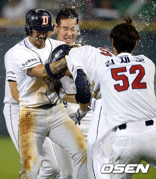 10회말 무사 만루 끝내기 안타를 때린 두산 오재일이 동료들에게 축하받고 있다. / youngrae@osen.co.kr