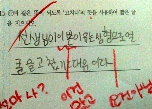 초등학생은 'ㅁ과 같은 뜻이 되도록 '고치다'의 뜻을 사용하여 짧은 글을 지으시오'라는 문제에 대해 "선생님이 이쁜 이유는 성형으로 얼굴을 고쳤기 때문이다"라고 대답했다.