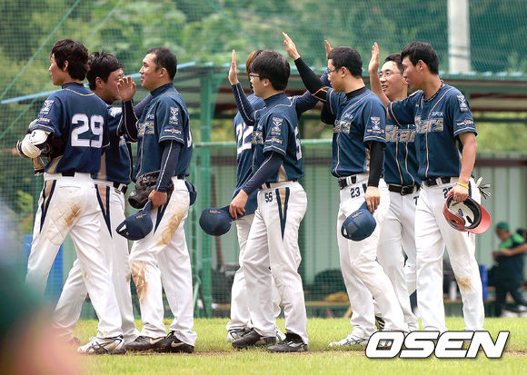 23일 오후 경기도 양평 신복리 야구장에서 열린 '제4회 니베아 맨 컵 전국생활체육 야구대회' 본스타즈와 수원슈퍼스타즈의 경기 종료 후 승리를 거둔 수원슈퍼스타즈 선수들이 기뻐하고 있다.