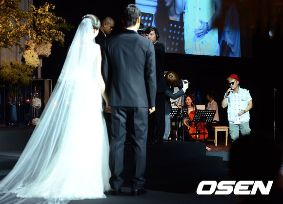 가수 이정이 고슬기와 주아영 부부를 위한 축가를 부르고 있다.