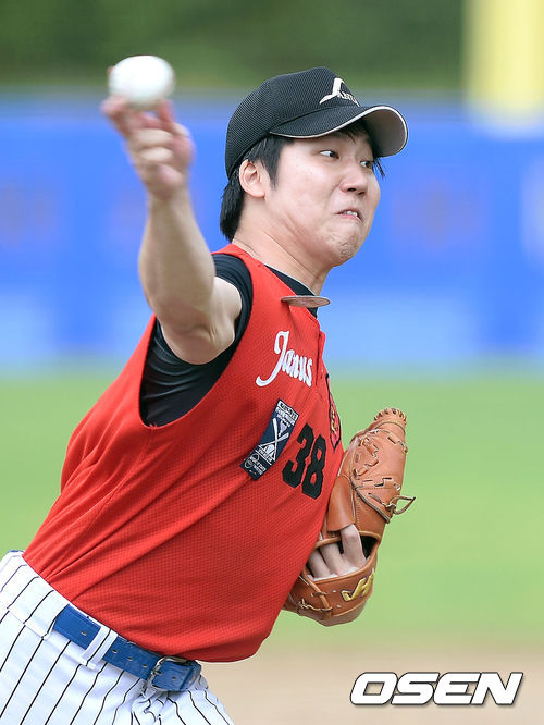 23일 오후 경기도 양평 신복리 야구장에서 열린 '제4회 니베아 맨 컵 전국생활체육 야구대회' 야누스와 스피릿츠의 경기, 1회말 야누스 선발 투수 오중교가 역투하고 있다.