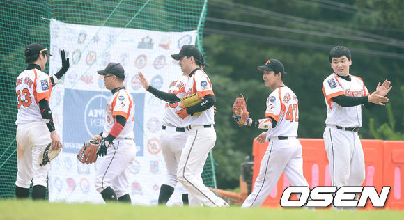 23일 오후 경기도 양평 신복리 야구장에서 열린 '제4회 니베아 맨 컵 전국생활체육 야구대회' 야누스와 스피릿츠의 경기, 4회초 수비를 마치고 스피릿츠 선수들이 기뻐하고 있다.