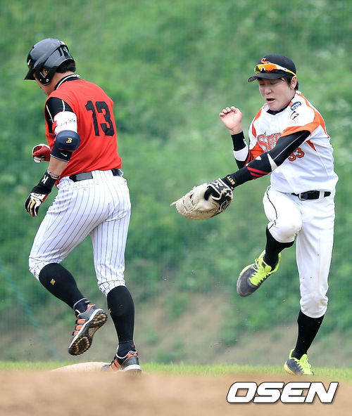 23일 오후 경기도 양평 신복리 야구장에서 열린 '제4회 니베아 맨 컵 전국생활체육 야구대회' 야누스와 스피릿츠의 경기, 3회말 스피릿츠 1루수가 태그아웃을 시도하였지만 태그가 늦어 세이프가 되었다.
