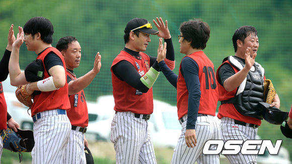 23일 오후 경기도 양평 신복리 야구장에서 열린 '제4회 니베아 맨 컵 전국생활체육 야구대회' 야누스와 스피릿츠의 경기 종료 후 승리를 거둔 야누스 선수들이 하이파이브를 하고 있다.