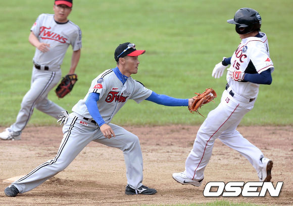 23일 오후 경기도 양평 신복리 야구장에서 열린 '제4회 니베아 맨 컵 전국생활체육 야구대회' 한국석유공사와 루트트윈스의 경기, 1회초 2사 1루 한국석유공사 김장학이 2루 도루를 시도하다 태그아웃 당하고 있다.