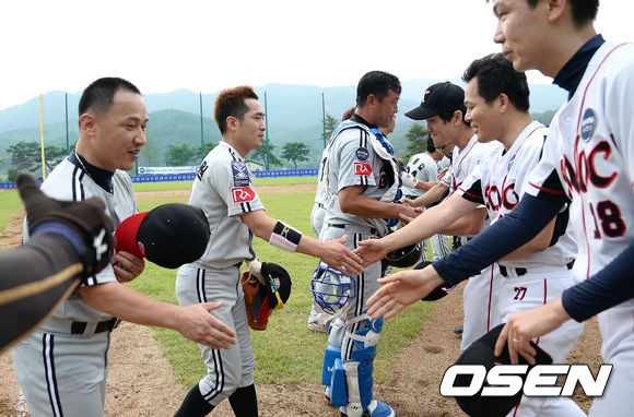 23일 오후 경기도 양평 신복리 야구장에서 열린 '제4회 니베아 맨 컵 전국생활체육 야구대회' 한국석유공사와 루트트윈스의 경기 종료 후 선수들이 악수를 나누고 있다.