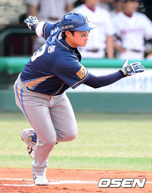 23일 오후 서울 목동야구장에서 열린 '2013 한국야쿠르트 세븐 프로야구' 넥센 히어로즈와 NC 다이노스의 경기, 1회초 2사 1,3루에서 NC 권희동이 선제 1타점 적시타를 날리고 타구를 바라보고 있다.