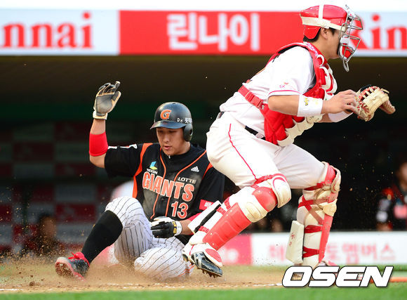 23일 오후 인천 문학야구장에서 열린 2013 한국야쿠르트 세븐프로야구 SK 와이번스와 롯데 자이언츠의 경기, 6회초 1사 만루에서 롯데 손아섭의 좌전 적시타 때 2루주자 황재균이 득점에 성공하고 있다.