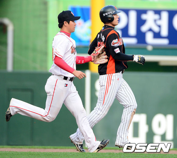 23일 오후 인천 문학야구장에서 열린 2013 한국야쿠르트 세븐프로야구 SK 와이번스와 롯데 자이언츠의 경기, 6회초 1사 만루에서 롯데 손아섭의 좌전 적시타 때 협살에 걸린 이승화가 태그아웃 처리되고 있다.
