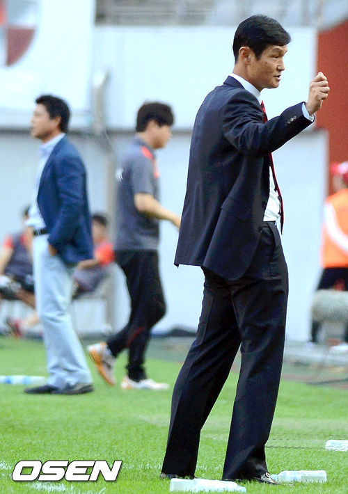 전반, 서울 최용수 감독이 벤치를 향하여 코치진과 작전을 구상하고 있다.