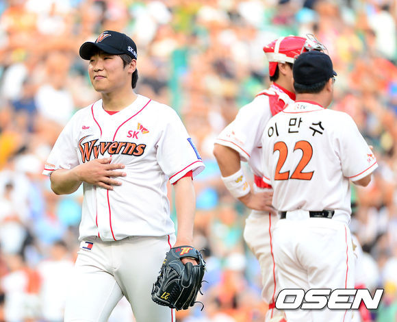 23일 오후 인천 문학야구장에서 열린 2013 한국야쿠르트 세븐프로야구 SK 와이번스와 롯데 자이언츠의 경기, 6회초 1사 만루에서 SK 백인식이 마운드를 내려가고 있다.