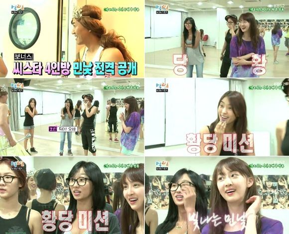이날 김종민은 씨스타에게 등목을 받으라는 미션을 수행하기 위해 이들의 안무 연습실을 찾았다. 기습 방문에 놀란 멤버들은 "모두 민낯인 상태로 방송에 출연한 것은 처음"이라며 당황스러워했다. 하지만 이내 웃음을 터트린 후 평정심을 되찾았다.