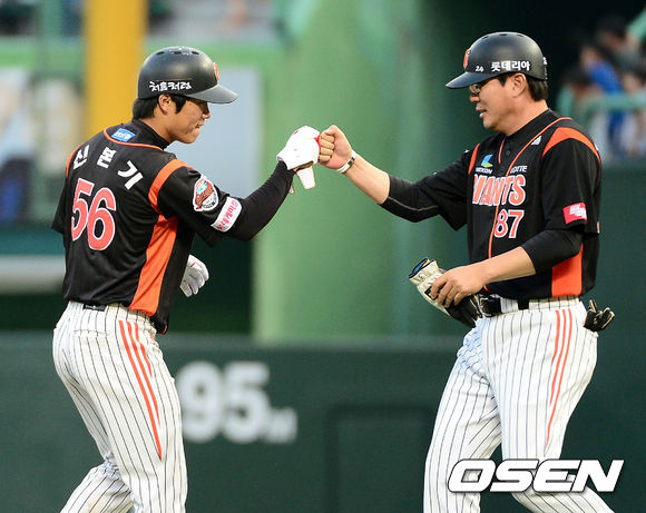 23일 오후 인천 문학야구장에서 열린 2013 한국야쿠르트 세븐프로야구 SK 와이번스와 롯데 자이언츠의 경기, 7회초 1사 1,2루에서 롯데 신본기가 좌전 적시타를 치고 김응국 코치화 하이파이브를 하고 있다.