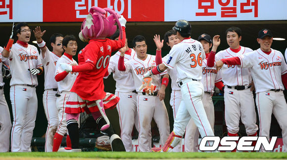 23일 오후 인천 문학야구장에서 열린 2013 한국야쿠르트 세븐프로야구 SK 와이번스와 롯데 자이언츠의 경기, 7회말 2사에서 SK 박정권이 중월 동점 솔로홈런을 치고 덕아웃에서 동료들과 환호하고 있다.