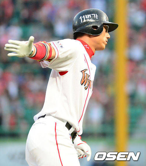 23일 오후 인천 문학야구장에서 열린 2013 한국야쿠르트 세븐프로야구 SK 와이번스와 롯데 자이언츠의 경기, 7회말 2사에서 SK 박정권이 중월 동점 솔로홈런을 치고 환호하고 있다.