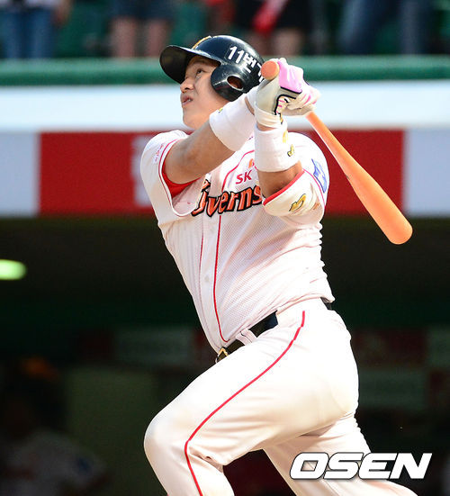 23일 오후 인천 문학야구장에서 열린 2013 한국야쿠르트 세븐프로야구 SK 와이번스와 롯데 자이언츠의 경기, 8회말 무사 1,3루에서 SK 정상호가 좌월 스리런 홈런을 치고 있다.