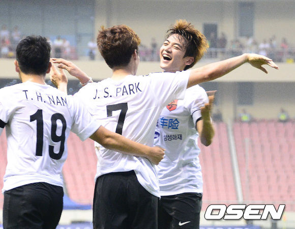 선취골을 성공한 박지성이 아이돌 스타 샤이니 민호로 부터 축하를 받고 있다. /spjj@osen.co.kr
