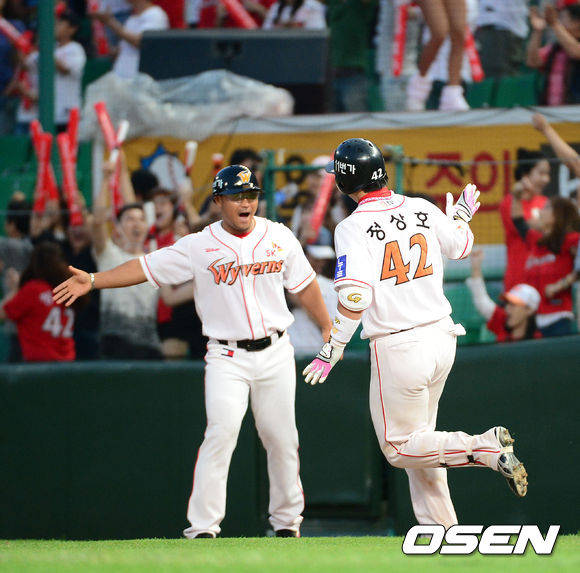 23일 오후 인천 문학야구장에서 열린 2013 한국야쿠르트 세븐프로야구 SK 와이번스와 롯데 자이언츠의 경기, 8회말 무사 1,3루에서 SK 정상호가 좌월 스리런 홈런을 치고 정경배 코치와 하이파이브를 하고 있다.