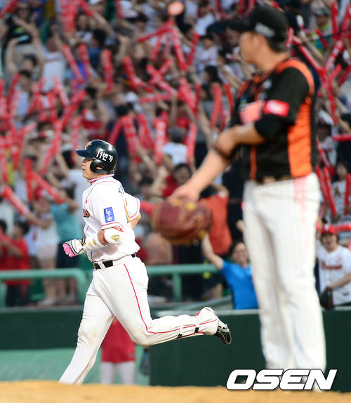 23일 오후 인천 문학야구장에서 열린 2013 한국야쿠르트 세븐프로야구 SK 와이번스와 롯데 자이언츠의 경기, 8회말 무사 1,3루에서 SK 정상호가 좌월 스리런 홈런을 치고 그라운드를 달리고 있다.