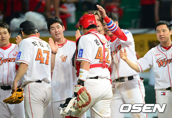 경기 종료 후 SK 정상호가 동료들과 승리의 기쁨을 나누고 있다. /sunday@osen.co.kr