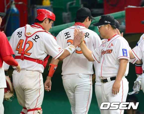 경기 종료 후 SK 정상호가 이만수 감독과 승리의 기쁨을 나누고 있다. /sunday@osen.co.kr