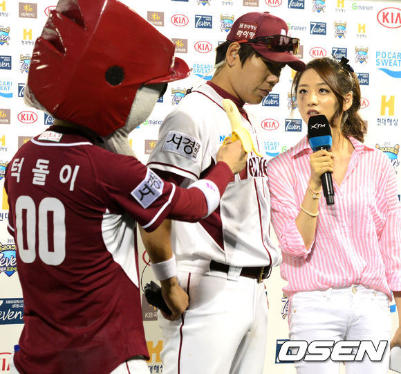 경기후 강정호 히어로 인터뷰에 턱돌이가 바나나를 건네며 승리를 축하해주고 있다./ jpnews@osen.co.kr