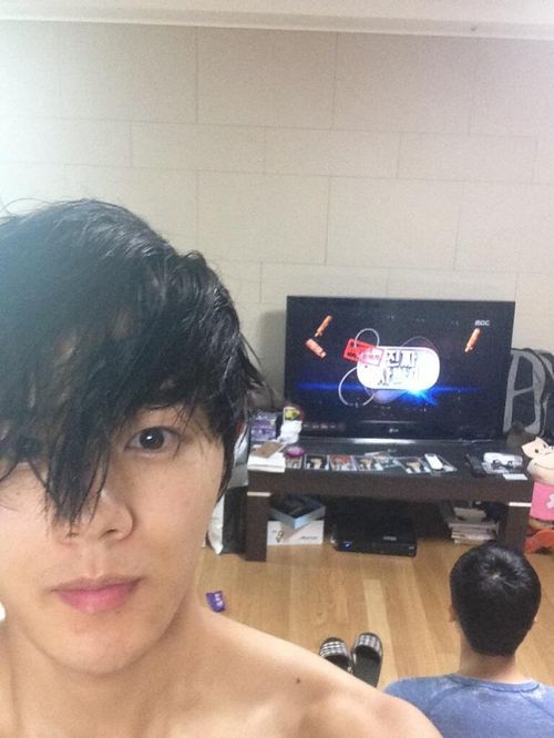 그는 23일 오후 자신의 트위터에 '진짜 사나이'가 시작되는 TV를 보고 있는 뒷모습이 담긴 사진을 공개했다. 멤버 동준은 상의를 벗고 카메라를 응시 중이다.