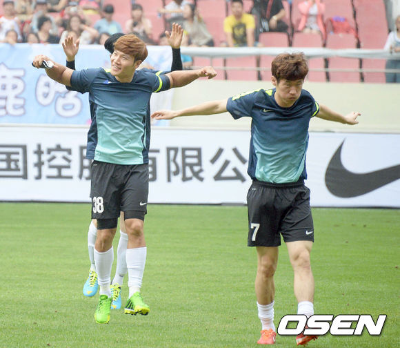 경기에 앞서 박지성과 런닝맨 출연진 김종국이 몸을 풀고 있다. /spjj@osen.co.kr
