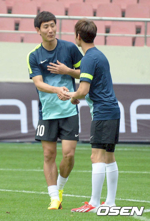 경기에 앞서 지동원과 샤이니 민호가 인사를 나누고 있다. /spjj@osen.co.kr